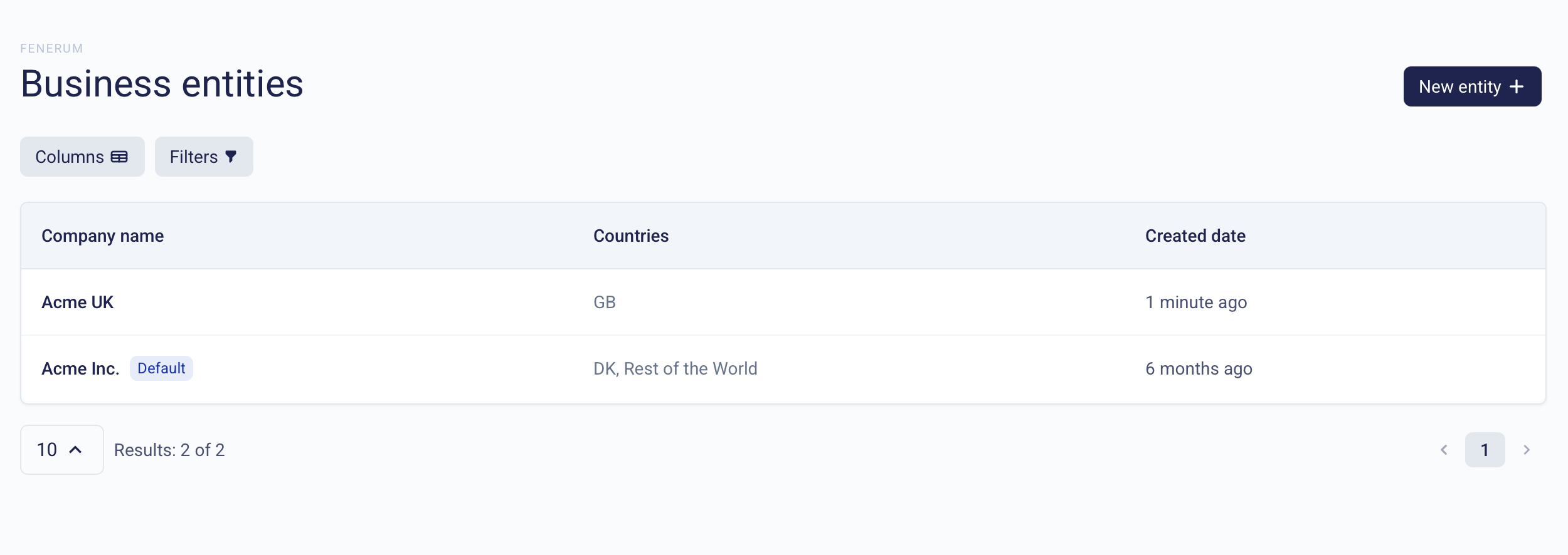 Business Entities on valinnainen ominaisuus eikä ole oletuksena aktiivinen. Ota yhteyttä osoitteeseen support@fenerum.com, jos haluat käyttää tätä ominaisuutta.